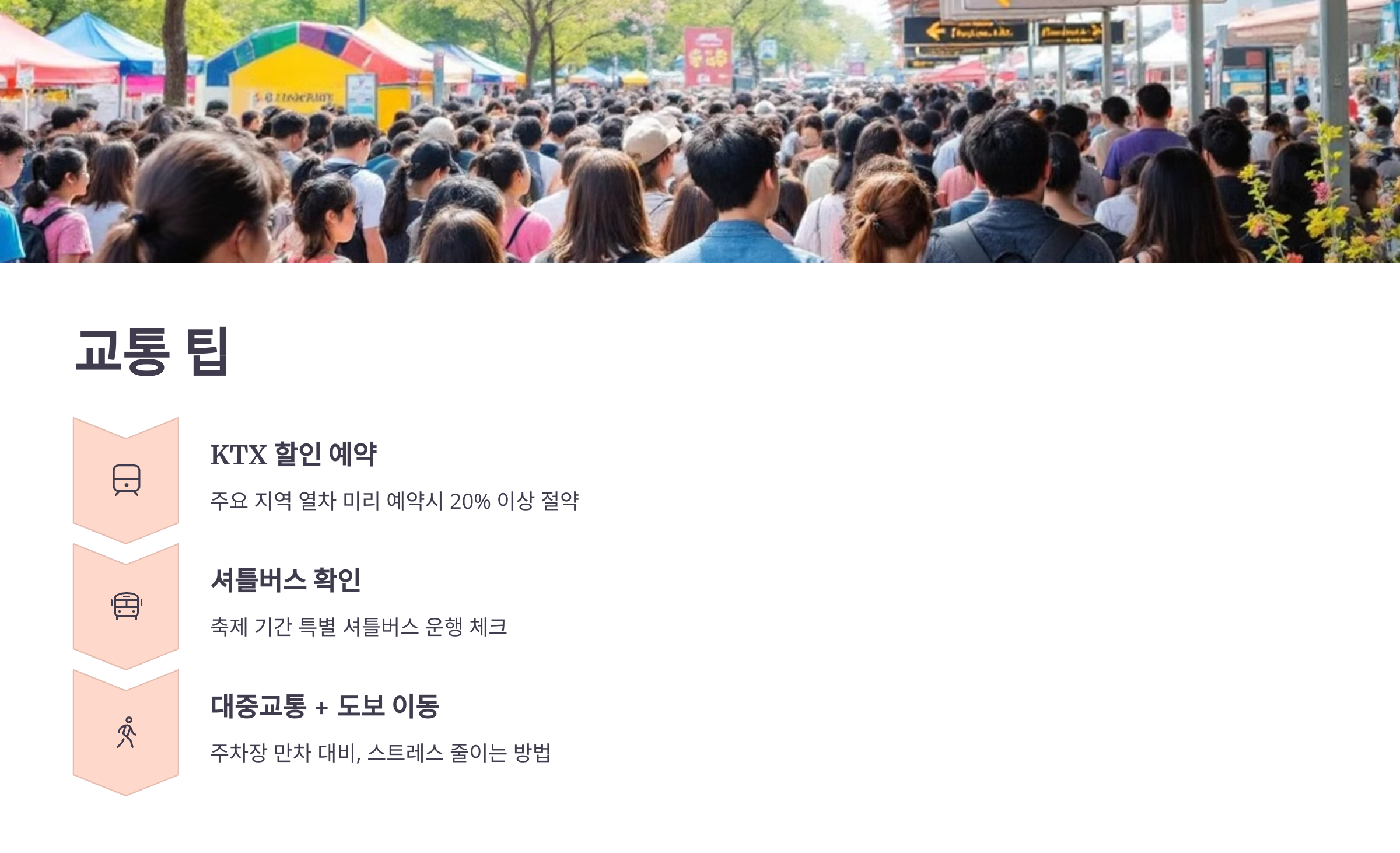 - 지자체 셔틀버스 운영 확인: 축제 기간엔 특별 셔틀버스가 운행되니 시청/관광청 홈페이지 참고.