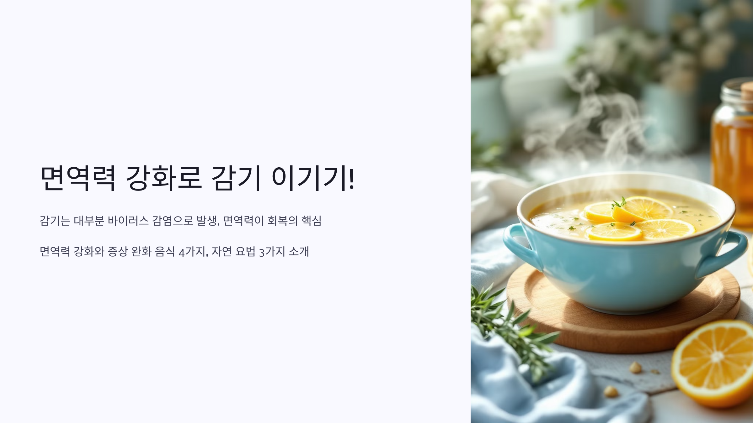 감기에 걸렸을 때 약보다 먼저 챙겨야 할 것은? 면역력 높이는 음식과 자연 요법 7가지를 소개합니다. 건강하게 회복하는 비결을 지금 확인하세요!