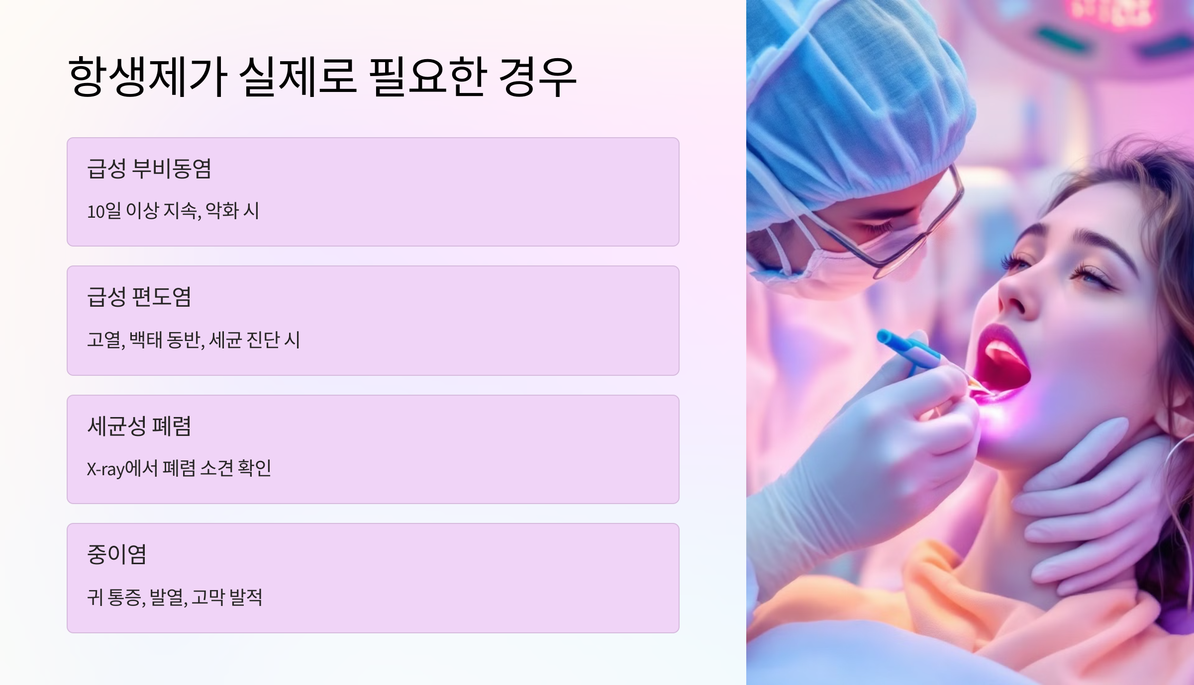 항생제가 필요한 경우는 세균성 2차 감염이 의심될 때입니다. 대표적인 사례는 아래와 같습니다.