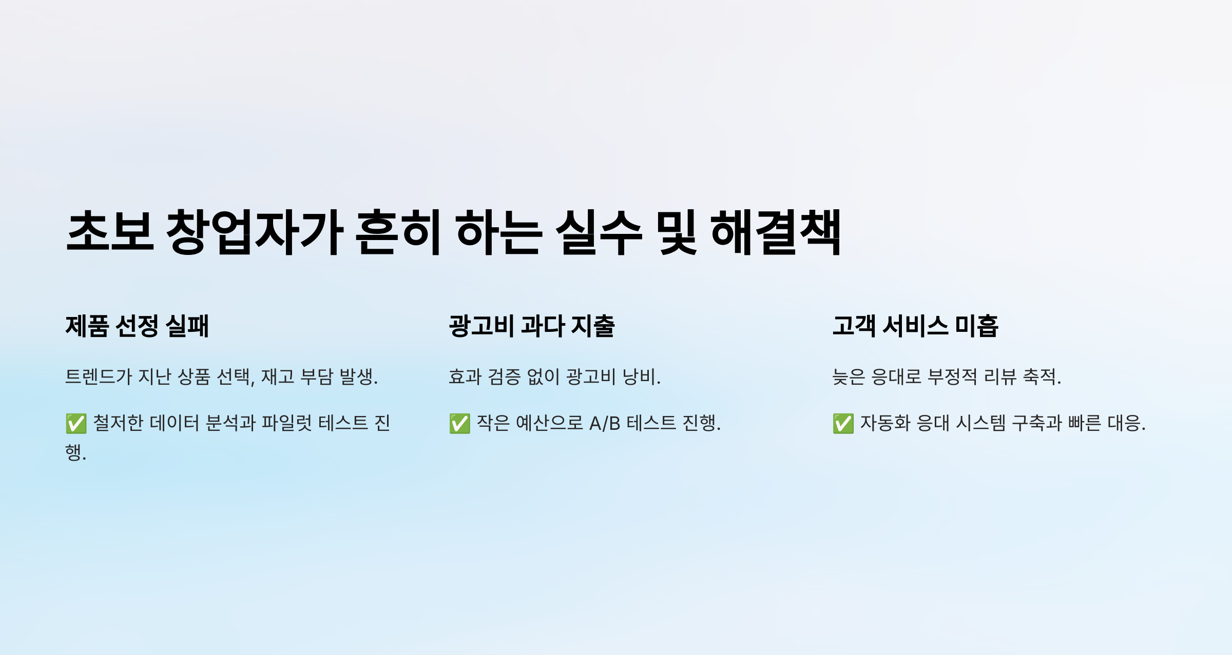초보 창업자들은 광고비를 과다하게 사용하여 손해를 보는 경우가 많습니다. ✅ 해결책: 작은 예산으로 A/B 테스트를 진행하며 가장 효과적인 광고 전략을 찾으세요.